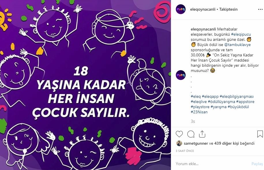 Eleq, ipucu sorusu her gün olduğu gibi bu gün de Instagram sayfasından yayınlandı. 23 Nisan Eleq ipucu sorusu şöyle yayınlandı: "Merhabalar eleqseverler, bugünkü eleqipucu sorumuz bu anlamlı güne özel. Büyük ödül tam 30.000₺ "On Sekiz Yaşına Kadar Her İnsan Çocuk Sayılır" maddesi hangi bildirgenin içinde yer alır, biliyor musunuz?"