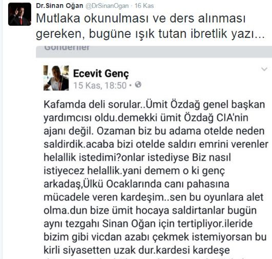 “Kafamda deli sorular. Ümit Özdağ, genel başkan yardımcısı oldu. Demek ki, Ümit Özdağ CIA’nın ajanı değil. O zaman biz bu adama otelde neden saldırdık acaba bizi otelde saldırı emrini verenler helallik istedi mi? Onlar istediyse biz nasıl isteyeceğiz helallik. Yani demem o ki genç arkadaş, Ülkü Ocaklarında canı pahasına mücadele veren kardeşim. Sen bu oyunlara alet olma. Dün bize Ümit hocaya saldırtanlar bugün aynı tezgahı Sinan Oğan için tertipliyor. İleride bizim gibi vicdan azabı çekmek istemiyorsan bu kirli siyasetten uzak dur. Kardeşi kardeşe düşman ettiler. Böl, parçala yönet taktiği ile koca camiayı birbirine düşürdüler kısacası lanet olsun bunların siyaseti…”