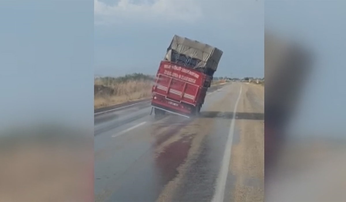 Adana'da Ceyhan-Kozan kara yolunun Haydarağa Köprüsü mevkisinde domates yüklü kamyonetin devrilmek üzere olduğunu fark eden başka bir araçtaki yolcu, cep telefonu kamerasıyla olayı kayda aldı.