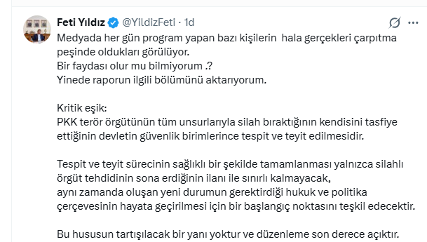 Kritik eşik: PKK terör örgütünün tüm unsurlarıyla silah bıraktığının kendisini tasfiye ettiğinin devletin güvenlik birimlerince tespit ve teyit edilmesidir. Tespit ve teyit sürecinin sağlıklı bir şekilde tamamlanması yalnızca silahlı örgüt tehdidinin sona erdiğinin ilanı ile sınırlı kalmayacak, aynı zamanda oluşan yeni durumun gerektirdiği hukuk ve politika çerçevesinin hayata geçirilmesi için bir başlangıç noktasını teşkil edecektir.