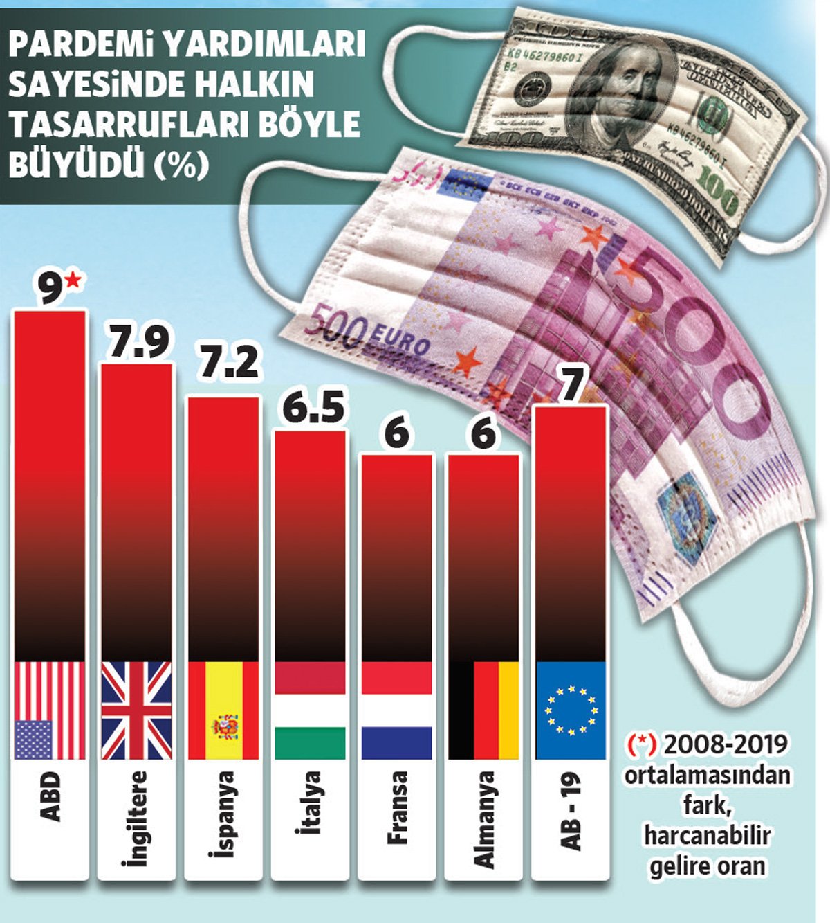 Çalışmada, 2020 yılında ABD, Almanya, Fransa, İngiltere, İspanya ve İtalya başta olmak üzere gelişmiş ülkeler genelinde hane halkı tasarruflarının salgın kaynaklı olarak belirgin bir şekilde arttığı bildirildi. Çalışmada, “Bu dönemde sosyal hareketlilikteki azalma, tüketim kalıplarındaki değişimler, devletlerin hane halkına doğrudan destekleri ve borç öteleme uygulamaları, bazı gelir gruplarında belirgin olmak üzere, tasarrufları olağan eğiliminin üzerine çıkarmıştır” tespiti yapıldı.