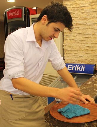 Servis görevlisiyim. Müşteriye sipariş götürüyorum, masaları ve tezgahı temizliyorum, vitrini düzenleme işi de bende. Ancak burada uzun süre çalışmayı düşünmüyorum. Her işi tek tek tadacağım. Okulumun bitmesine son 1 yıl kaldı. Zayıf olan derslerimi verebilirsem kısa dönem askerlik yaparım. Derslerimi veremezsem, askerliğe gidip gelirim. Sonra da kendime iş kurmak istiyorum.