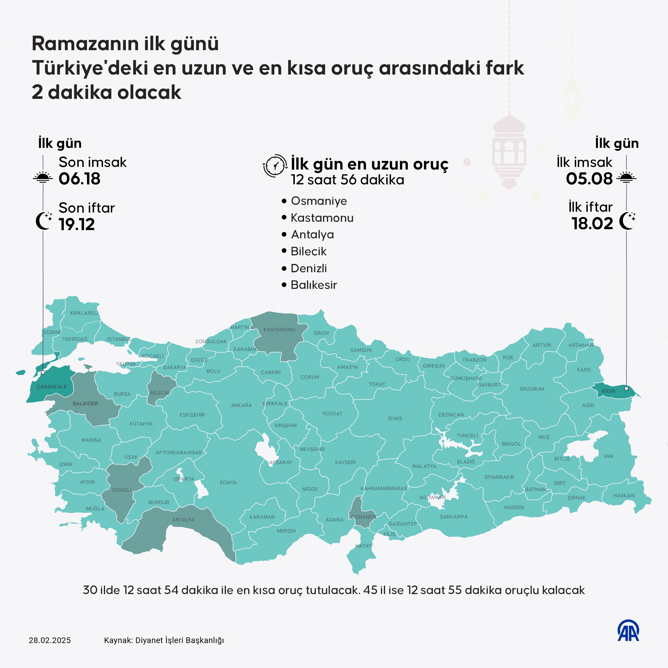 Osmaniye, Kastamonu, Antalya, Bilecik, Denizli ve Balıkesir'de 12 saat 56 dakika ile en uzun, 30 ilde ise 12 saat 54 dakika ile en kısa oruç tutulacak.