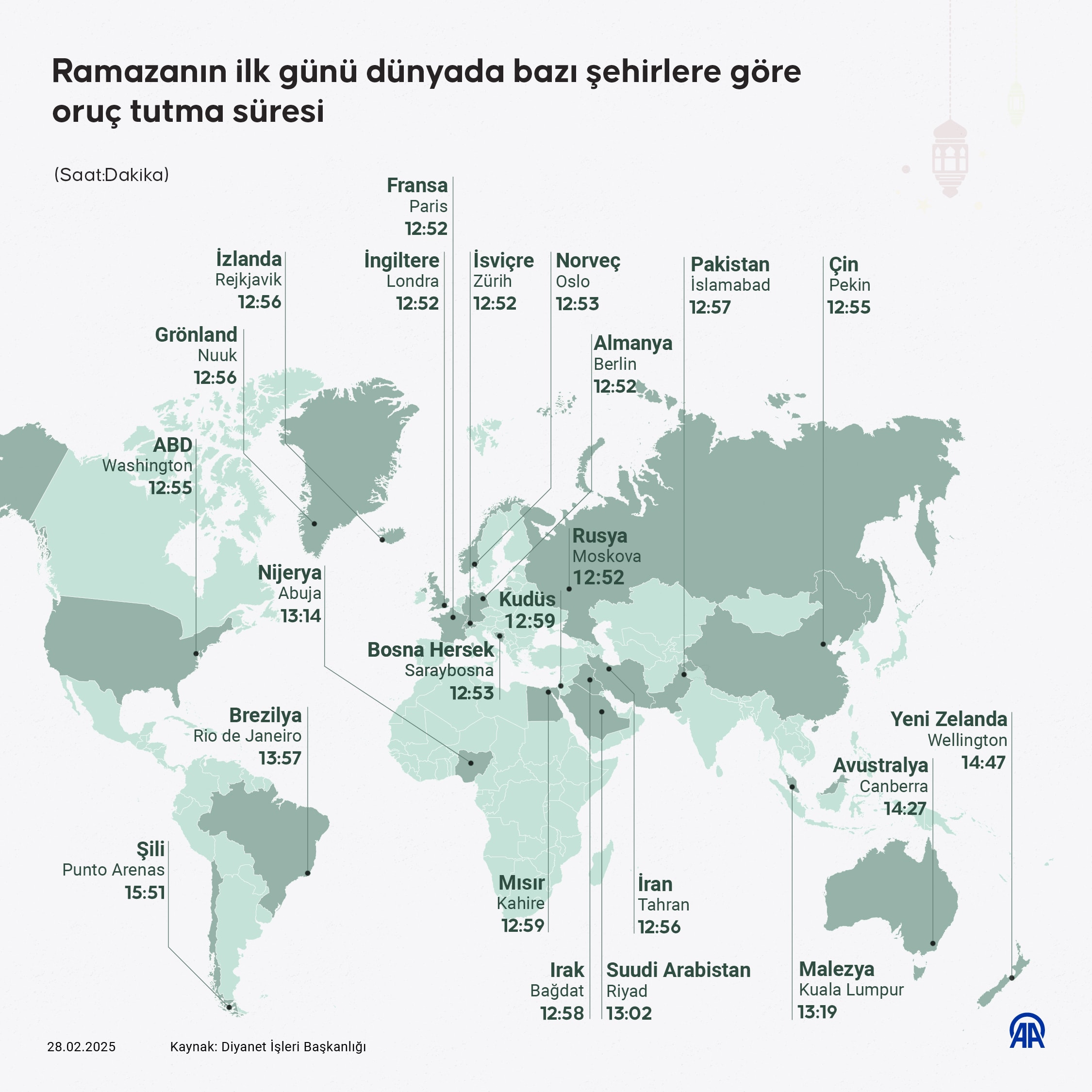 Güney Afrika'nın Johannesburg kentinde 14 saat 3 dakika, Danimarka'nın başkenti Kopenhag'ta 12 saat 52 dakika, Rusya'nın başkenti Moskova'da 12 saat 52 dakika oruç tutulacak.
