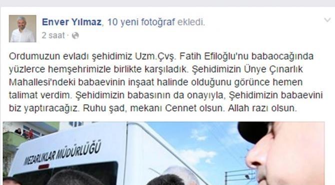 Ordu Büyükşehir Belediye Başkanı Ak Partili Enver Yılmaz, Diyarbakır’ın Sur İlçesi'nde güvenlik güçleriyle PKK'lı teröristler arasında çıkan çatışmada, şehit olan Uzman Çavuş Fatih Efiloğlu’nun Ünye İlçesi Çınarlık Mahallesi’ndeki baba ocağını ziyaret ederek taziyede bulundu. Şehidin babası Mustafa Efiloğlu’na taziye dileklerinde bulunan Enver Yılmaz tek katlı evin yaptırılacağını belirtti.
