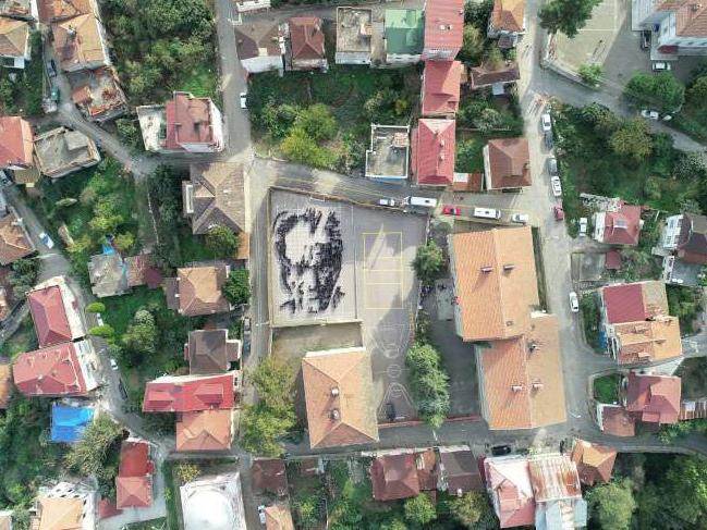 Yaklaşık 550 öğrenci, öğretmenlerinin de desteğiyle okul bahçesinde Atatürk'ün silüetini oluşturdu. Öğrencilerin hazırladığı gösteri havadan da