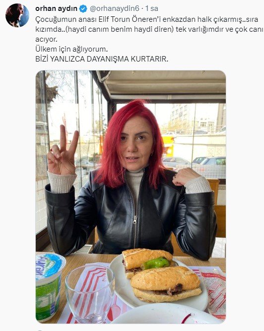 Orhan Aydın 19.30 sıralarında paylaştığı yeni mesajında, "Çocuğumun anası Elif Torun Öneren’i enkazdan halk çıkarmış..sıra kızımda..(haydi canım benim haydi diren) tek varlığımdır ve çok canım acıyor. Ülkem için ağlıyorum. BİZİ YANLIZCA DAYANIŞMA KURTARIR" dedi.