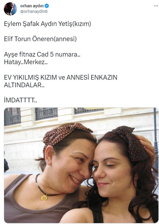 Twitter hesabından Hatay'da yaşayan kızı ve eski eşinin enkaz altında kaldığını duyuran tiyatrocu Orhan Aydın da "Eylem Şafak Aydın Yetiş (kızım). Elif Torun Öneren (annesi). Ayşe Fitnaz Caddesi 5 numara... Hatay Merkez. Ev yıkılmış. Kızım ve annesi enkaz altında. İmdat" ifadelerini kullandı.