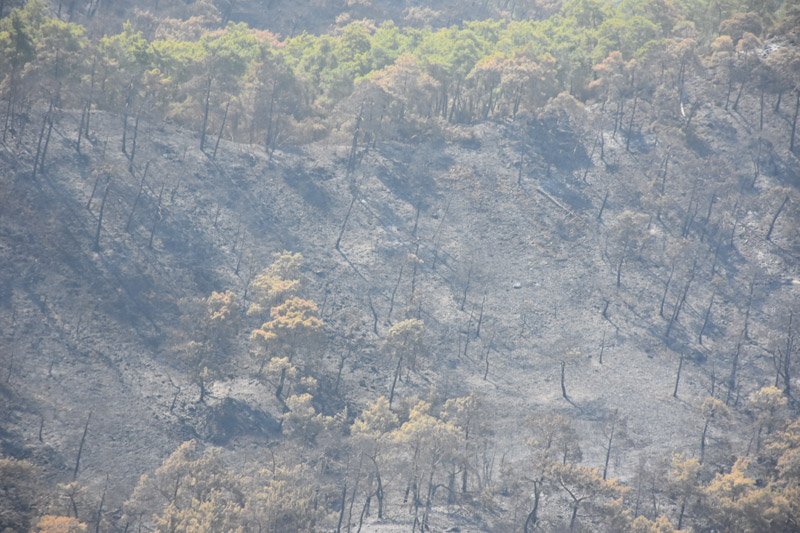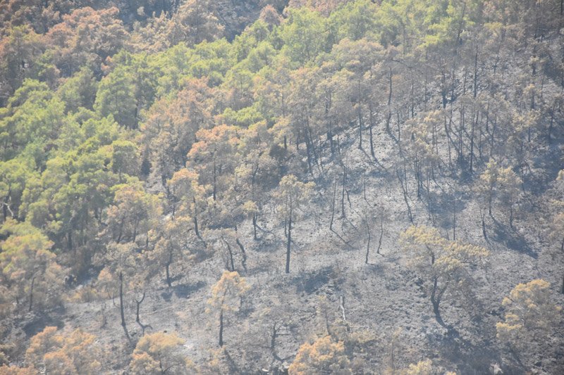 Yanan alanlar, Orman Genel Müdürlüğü Yangın Yönetim Helikopteri ile havadan görüntüledi. Bölgedeki yeşil alanların gri ve siyah tonlara dönüştüğü görüldü.