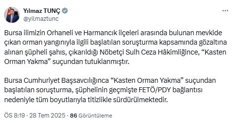 Orman yakan ve benzinle yakalanan Ufuk A., çıkarıldığı mahkemece tutuklandı. Gelişmeyi Adalet Bakanı Yılmaz Tunç sosyal medya hesabından duyurdu.