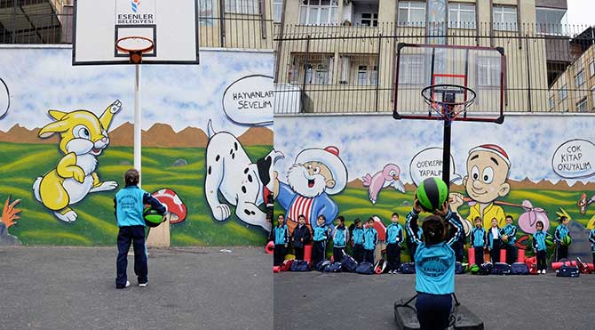 Bu fotoğrafta okulun orjinal basketbol potasıyla Ahmet öğretmene ait taşınabilir yüksekliği ayarlanılabilir potaları görebilirsiniz.Ahmet Naç, Esenler Mehmet Akif Ersoy İlkokulu 1-E sınıfının öğretmeni...Baştan ayağı yenilediği sınıfıyla, uyguladığı farklı eğitim yöntemleriyle dikkatleri çekti ve fark yarattı.