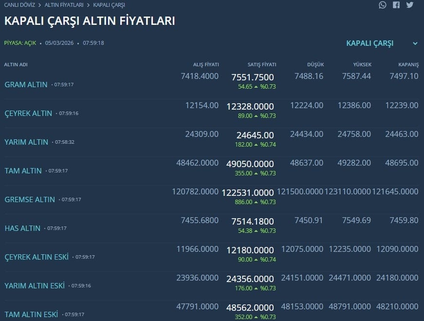 Kapalıçarşı altın fiyatları ile resmi altın fiyatları arasındaki fark devam ediyor. Kapalıçarşı'da gram altın 7 bin 551 lirada bulunuyor.