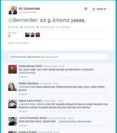 TBMM İdare Amiri ve MHP Aydın Milletvekili Ali Uzunırmak’ın, sanal alemde kendisine eleştirenlere twitter’dan "Siz g… kılısınız yaaa" diye cevap vermesi tepki çekti.