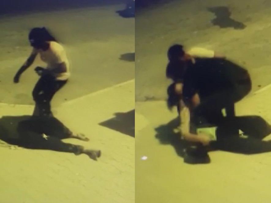 Saldırgan, daha sonra yanına gittiği eşini yerden kaldırdı. Olay anı ise çevredeki iş yerinin güvenlik kamerasınca anbean kaydedildi.
