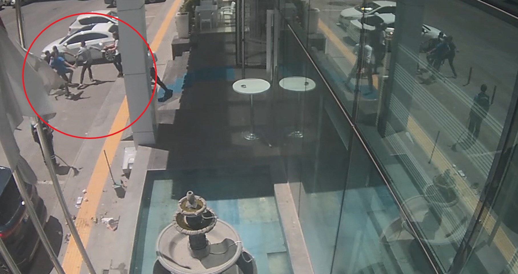 Görüntülerde, süs havuzundaki paraları almayan çalışan kağıt toplayıcılarının kendilerini uyaran Necat Y.’ye çöp kovası attığı, karşılık vermeye çalışan Necati Y.’nin aldığı tekmeyle yere düştüğü, şüphelilerden birinin yanındaki bıçağı Necat Y.’ye doğru salladığı, Necat Y.’yi yer yatırıp, tekmeledikleri, ayırmaya çalışan otel çalışanlarını da darbetmeye çalıştıkları görülüyor.