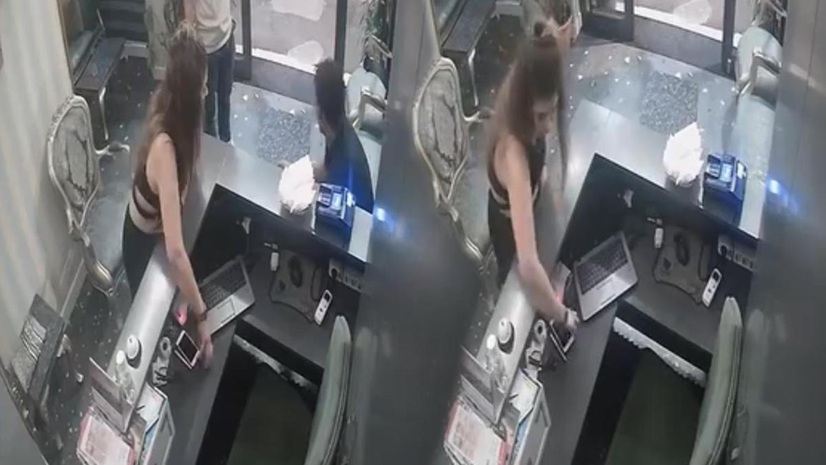 Olay 3 Eylül Salı günü Taksim Kocatepe Mahallesi’nde saat 22.00 sıralarında meydana geldi. Sevgilisiyle otele gelen kadın, 'Toprağım boş yerin var mı' diyerek çalışandan oda istedi. Boş oda olmadığını duyan kadın ardından resepsiyondaki masada duran cep telefonuna yöneldi. İlk hamlesinde telefonu alamayan kadın bir süre dışarıya çıktı. Birkaç dakika sonra çalışanın resepsiyondan ayrıldığını gören kadın, geri dönerek masadaki cep telefonunu çaldı. Hırsızlık anları güvenlik kamerasına yansıdı.