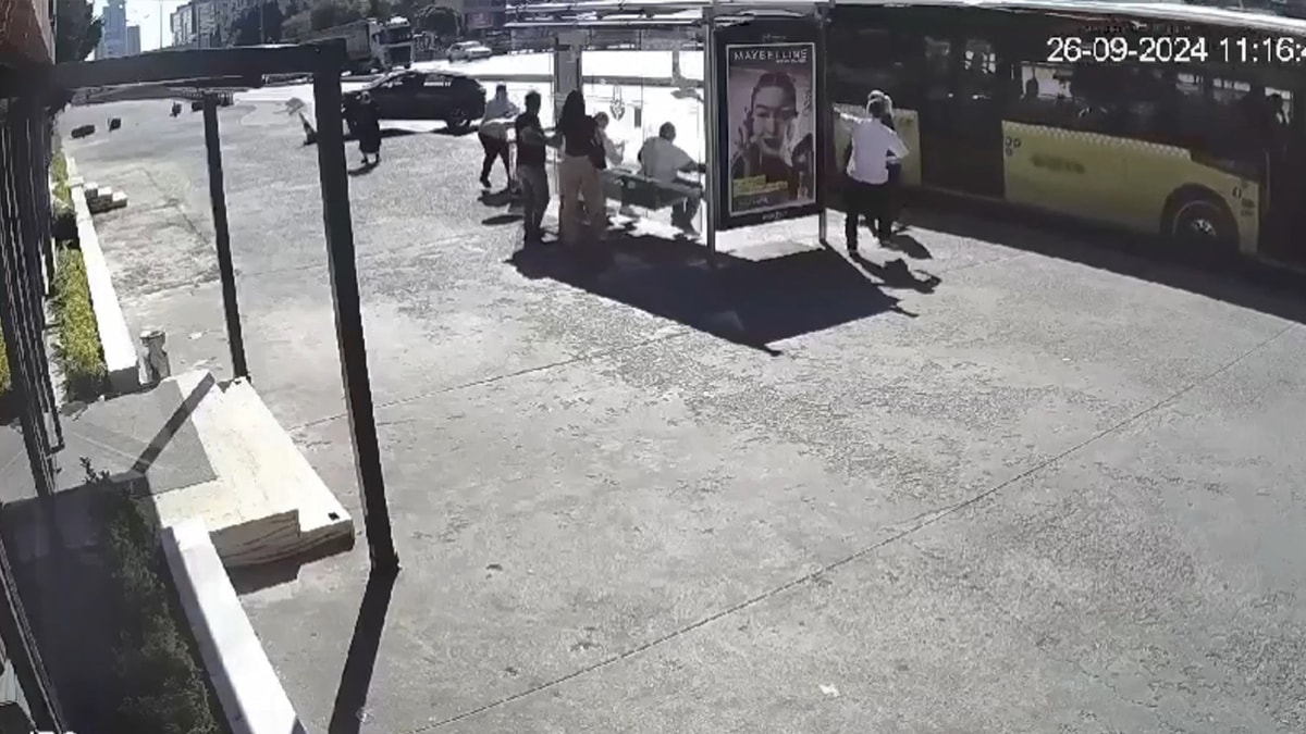 İş yerinin güvenlik kamerasına yansıyan görüntülerde, otomobilin seyir halindeyken kontrolden çıkarak kaldırımdaki yayaya çarpıp savrulduğu anlar yer alıyor. Ardından otomobilin otobüs durağına daldığı, durakta bekleyen vatandaşların korkuya kapılarak kaçtığı, kaçarken 2 vatandaşın yere düştüğü görülüyor. Korku dolu anlar güvenlik kamerasına saniye saniye yansıdı.