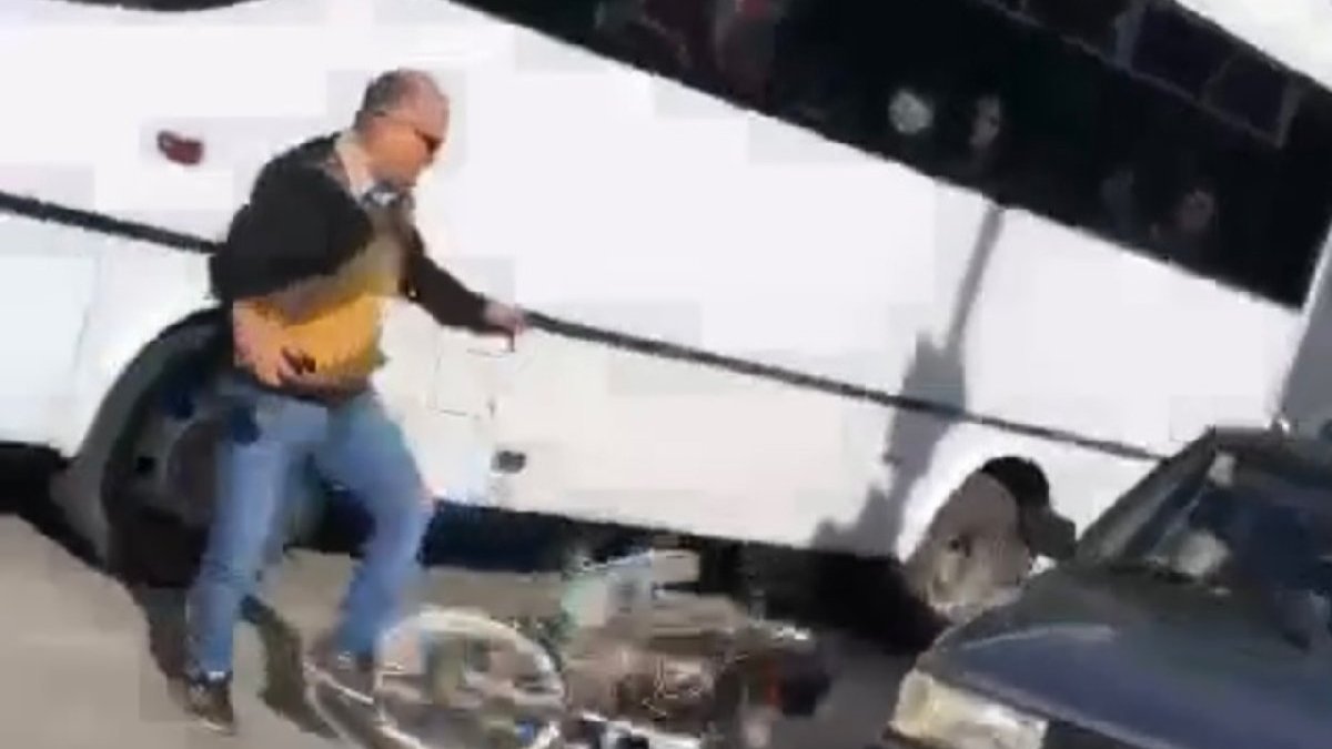 Cep telefonu kamerasına yansıyan görüntülerde otobüs şoförünün camdan küfür ettiği ve otobüsten inerek motosikleti tekmelediği görüldü.