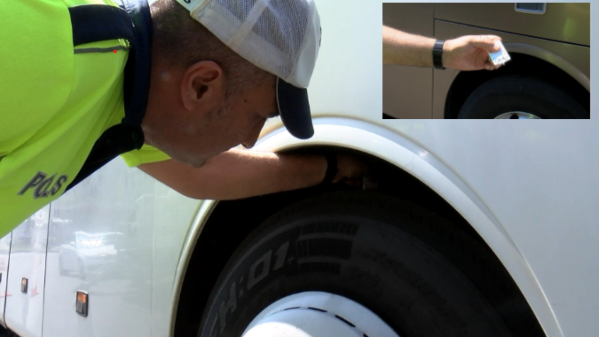 Trafik ekipleri otobüslerin tekerleklerinin prosedüre uygunluğunu da kontrol etti. (DHA)