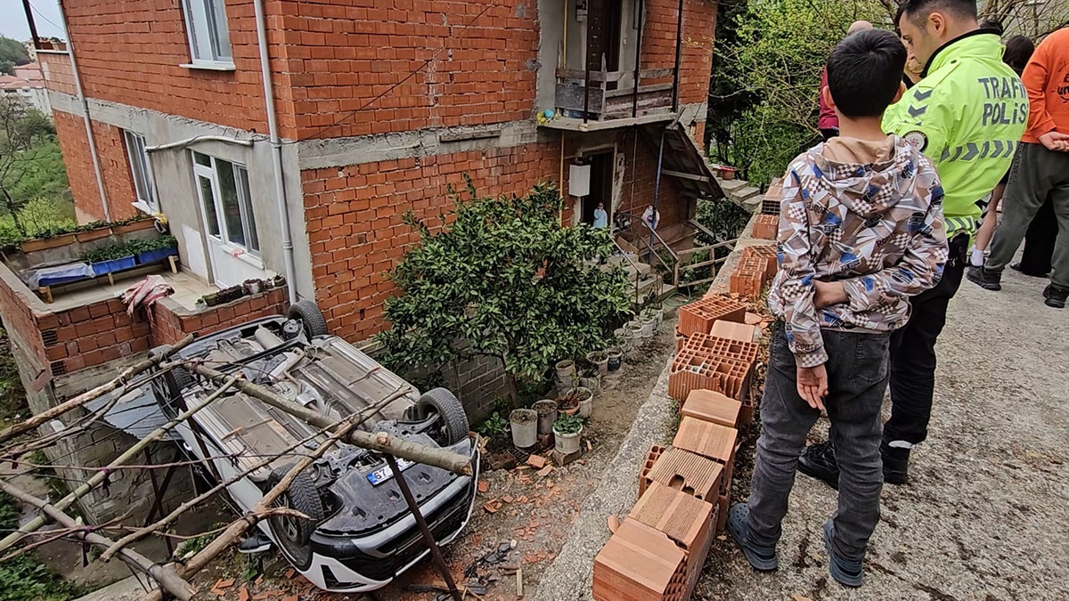 Zonguldak'ta evinin önüne park etmeye çalıştığı otomobilin 2 metreden bahçeye düşmesi sonucu sürücü Kumsal G. hafif yaralandı.