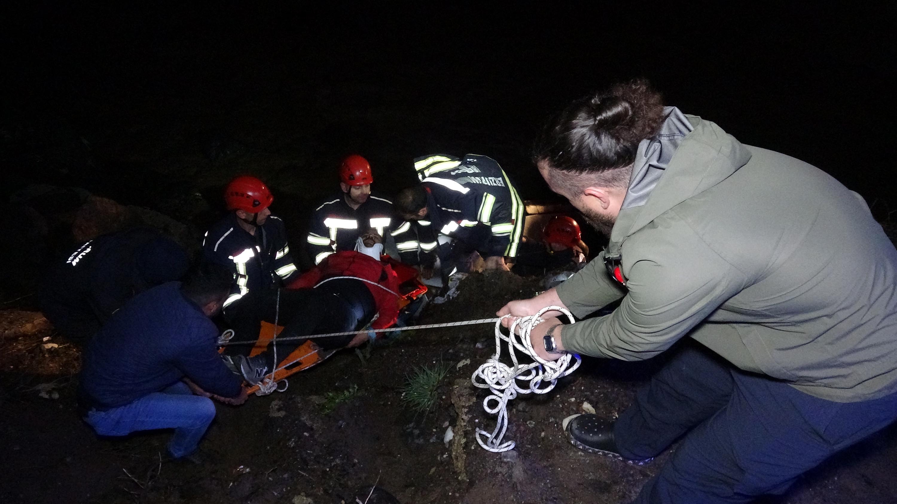 İhbar üzerine olay yerine sağlık, itfaiye ve polis ekipleri sevk edildi. Sürücü Furkan K. ve arka koltukta oturan Ercan B., araçtan kısa sürede çıkarılırken, ön koltukta sıkışan Kadir Ö. itfaiye ekiplerinin halatla gerçekleştirdiği dikkatli çalışmayla bulunduğu yerden kurtarıldı.