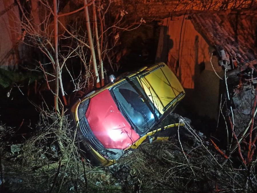 Amasya'da yolun aşağısındaki evin çatısına uçup bahçeye devrilen otomobilin sürücüsü Yasin D. yaralandı. Sürücü kaza yerinden kaçarken, evin çatısında hasar oluştu.