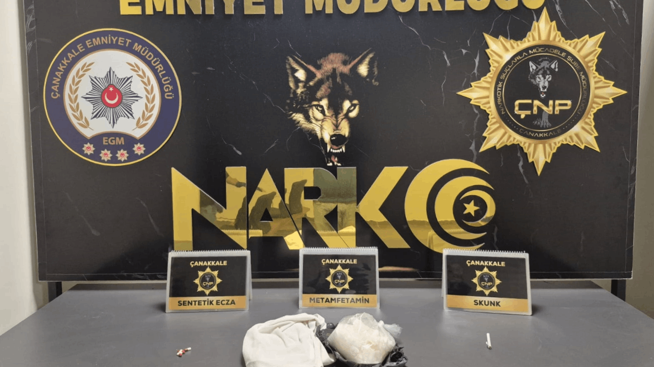 Şüphelilere ait otomobilde yapılan aramada, aracın yolcu koltuğunun altına saklanmış halde 1 kilo 50 gram metamfetamin ile 4 sentetik ecza ve içine skunk konulmuş sigara ele geçirildi.