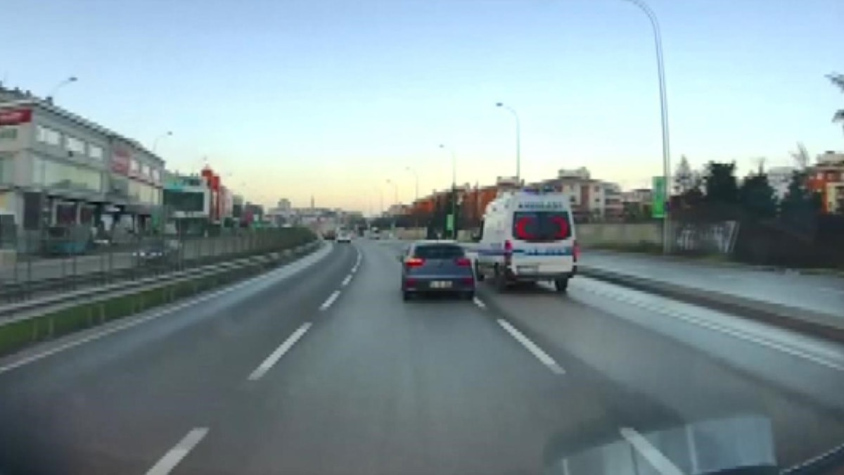 Ambulans şoförünün korna ve siren çalmasına aldırış etmeyen sürücü, ambulansı sıkıştırarak trafiği tehlikeye attı. Otomobil daha sonra hızla uzaklaştı.