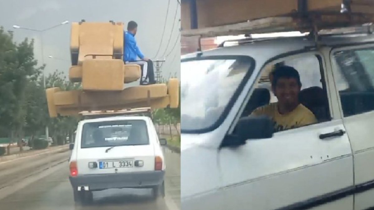 Adana'nın Ceyhan ilçesinde, bir kişinin otomobilin tavanında taşınan koltuk takımının üzerindeki yolculuğu, cep telefonu kamerasıyla görüntülendi.