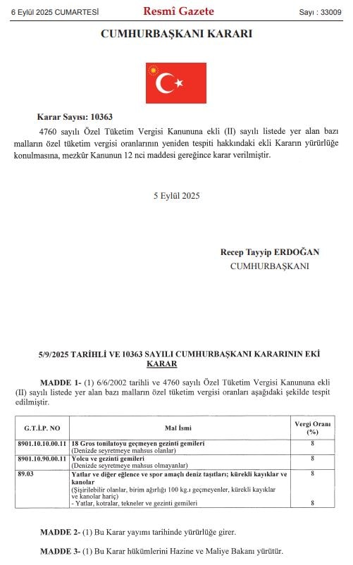 Cumhurbaşkanı Recep Tayyip Erdoğan’ın imzasıyla Resmi Gazete’de yeni kararlar yayımlandı. Özel Tüketim Vergisi (ÖTV) oranlarında düzenlemeye gidildi. Buna göre, yat, kotra, 18 gros tonilatoyu geçmeyen gezinti gemileri ile eğlence ve spor amaçlı kullanılan deniz taşıtlarında sıfır olan ÖTV oranı yüzde 8 olarak belirlendi.