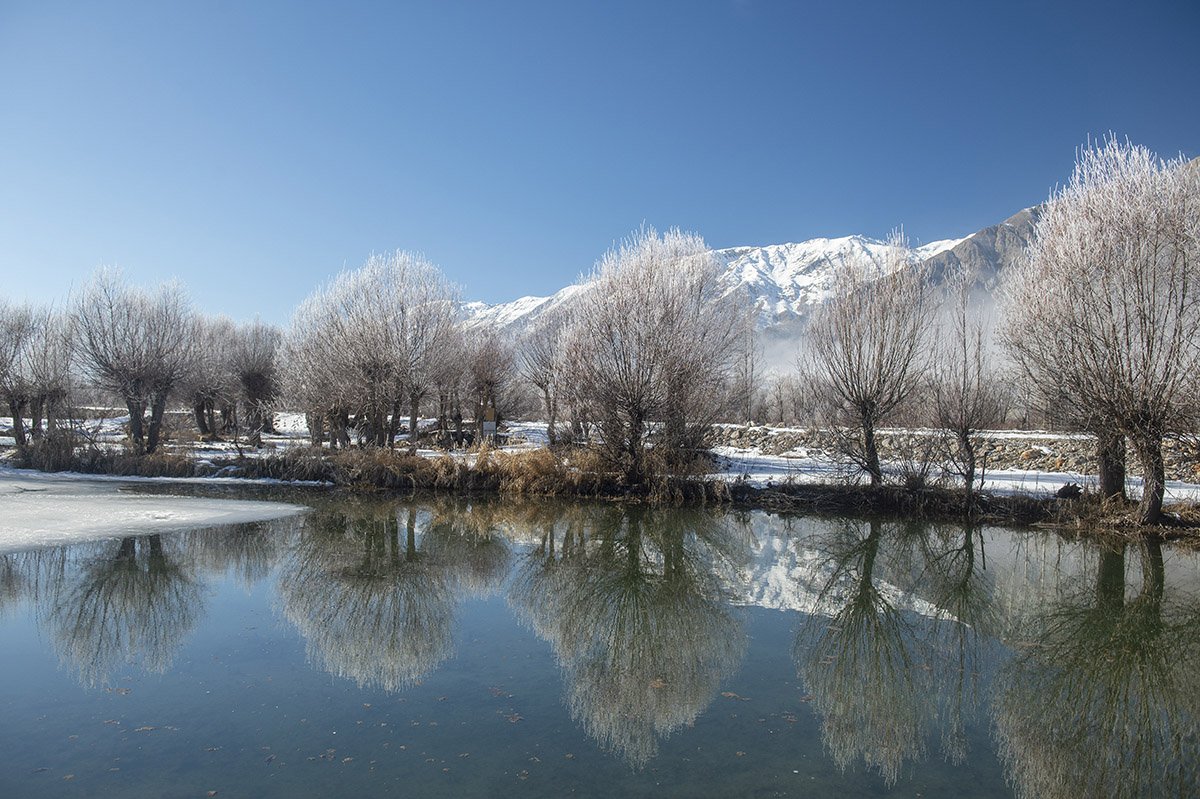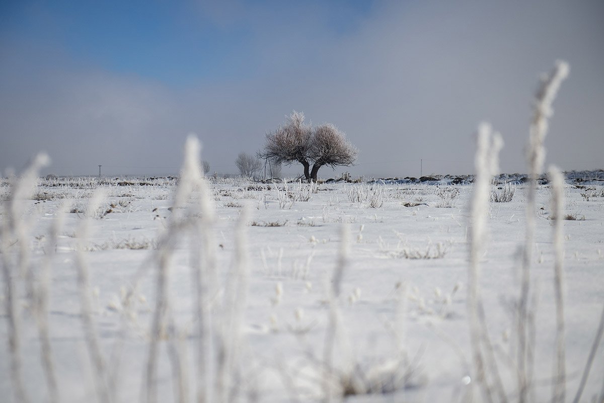 Bir süre önce yağan kar ile beyaza bürünen ilçede, soğuk havanın etkisiyle ağaçlar ve bitkiler kırağı tuttu.