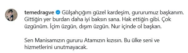 "Gülşahçığım güzel kardeşim, gururumuz başkanım. Gittiğin yer buradan daha iyi baksın sana. Hak ettiğin gibi. Çok üzgünüm. İçim üzgün, dışım üzgün. Nur içinde ol başkan. Sen Manisamızın gururu Atamızın kızısın. Bu ülke seni ve hizmetlerini unutmayacak."