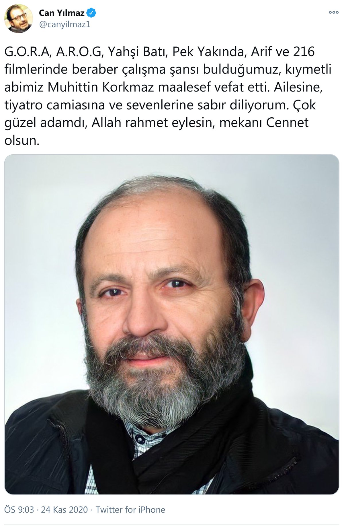 Oyuncu ve senarist Can Yılmaz ise mesajında "G.O.R.A, A.R.O.G, Yahşi Batı, Pek Yakında, Arif ve 216 filmlerinde beraber çalışma şansı bulduğumuz, kıymetli abimiz Muhittin Korkmaz maalesef vefat etti. Ailesine, tiyatro camiasına ve sevenlerine sabır diliyorum. Çok güzel adamdı, Allah rahmet eylesin, mekanı Cennet olsun" ifadelerine yer verdi.