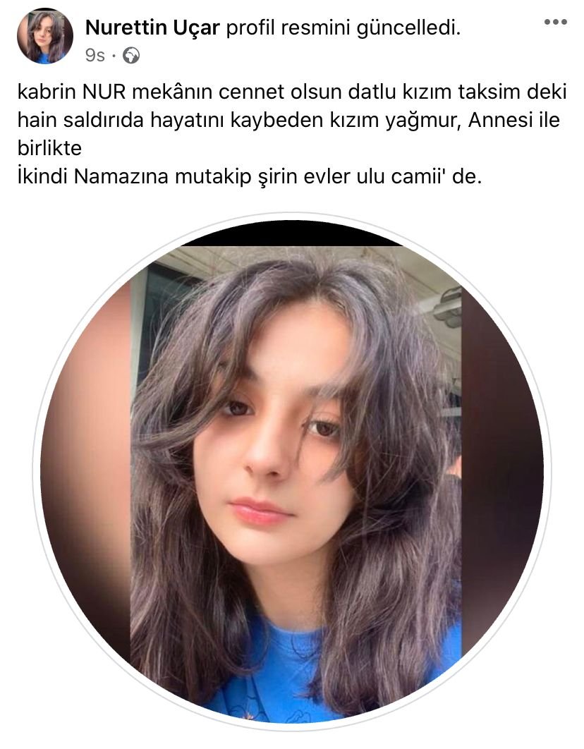 Kızı Yağmur Uçar'ın fotoğrafını Facebook'ta profil fotoğrafı yapan oyuncu, "Kabrin nur, mekanın cennet olsun datlu kızım. Taksim'deki hain saldırıda hayatını kaybeden kızım Yağmur, annesi ile ikindi namazına müteakiben Şirinevler Ulu Camii'nde" ifadelerini kullandı.