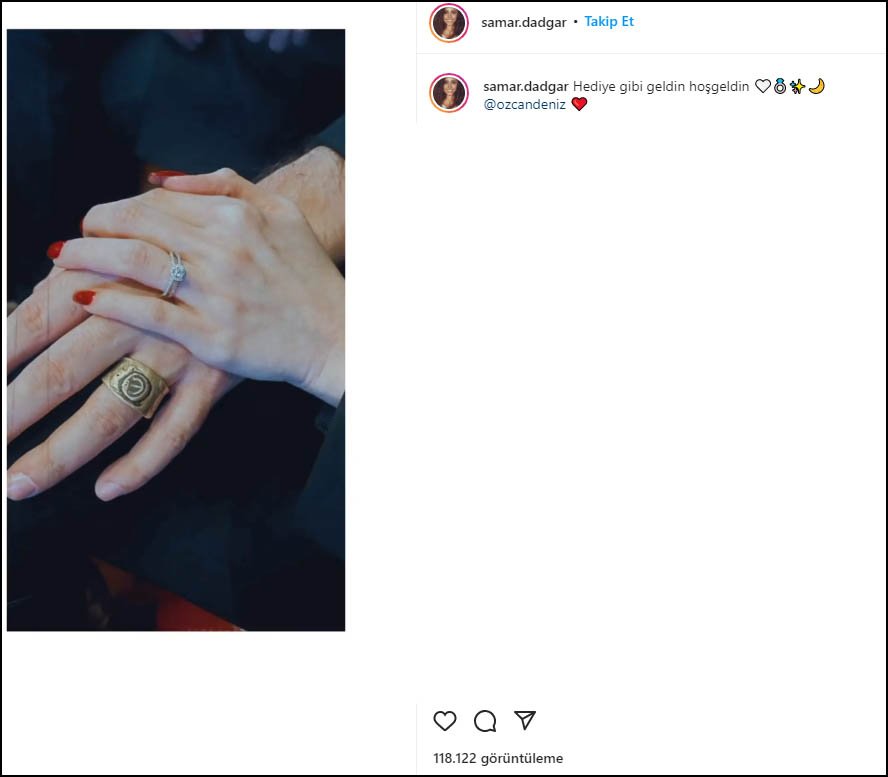 Kendisinden 24 yaş büyük olan Özcan Deniz (50) ile aşk yaşayan Samar Dadgar, Instagram hesabından tektaş yüzüklü fotoğrafını paylaşarak evlilik teklifi aldığını müjdeledi.