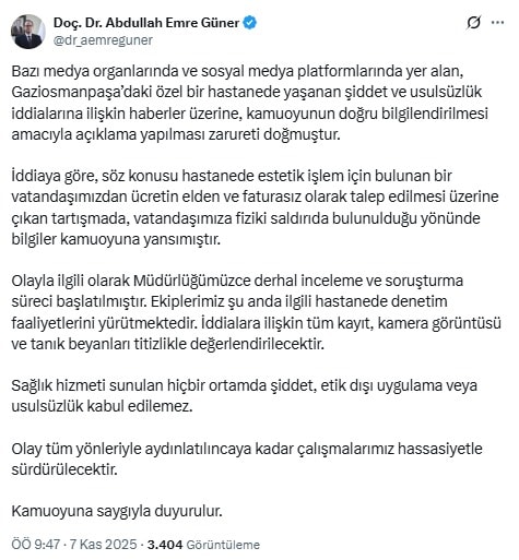 “Sağlık hizmeti sunulan hiçbir ortamda şiddet, etik dışı uygulama veya usulsüzlük kabul edilemez. Olay tüm yönleriyle aydınlatılıncaya kadar çalışmalarımız hassasiyetle sürdürülecektir.”