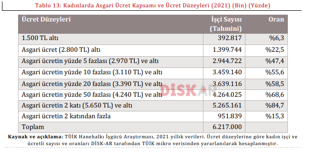 Raporda kadınların çok büyük bir bölümünün asgari ücret ve daha altında ücretlerle çalıştığı saptandı. Asgari ücretin yüzde 10 fazlası ve altında ücret alanların oranı genelde yüzde 48,7 iken kadınlarda yüzde 55,6 oldu.