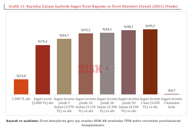 DİSK-AR tarafından kaleme alınan raporda, özel sektör işçilerinin yüzde 21,7’sinin asgari ücrete erişemediği açıklandı. Ayrıca özel sektörde asgari ücret ve altında ücretle çalışanların oranının yüzde 50,4, asgari ücret civarında (yüzde 10 altında veya üstünde) çalışanların oranının yüzde 64,7 olduğu aktarıldı.