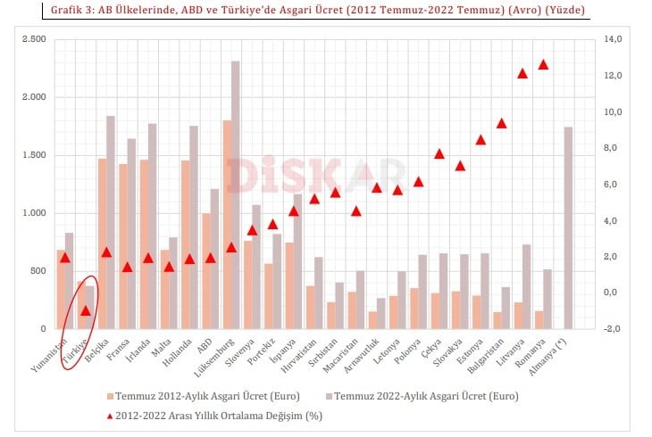 2012’de Avrupa’da Türkiye’den düşük asgari ücrete sahip 12 ülke varken, 2022’de bu sayı 2’ye düştü. Türkiye’den daha düşük asgari ücrete sahip iki ülke Bulgaristan ve Arnavutluk oldu.