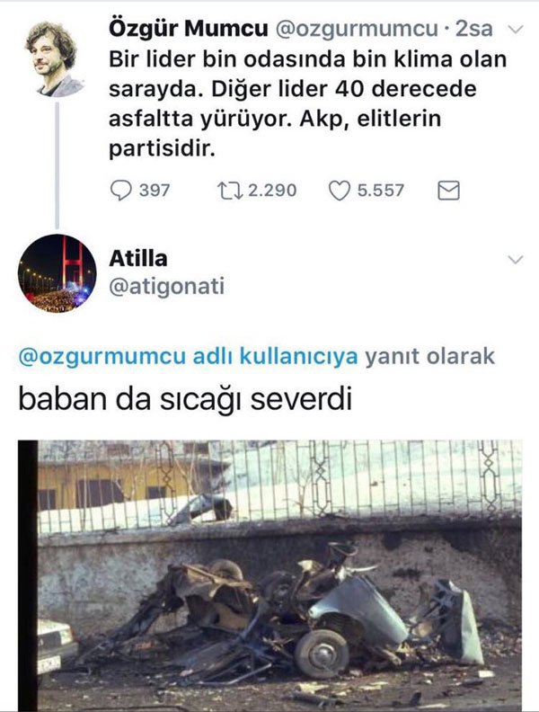 Uğur Mumcu'nun kızı Özge Mumcu ise sosyal medya hesabından yaptığı açıklamada şu ifadeleri kullandı: "Bu mesajı yeni gördüm. Memlekette kötü ruhlu insan da var, güzel insanlar da. Biz güzellerine bakalım. Babamın öldürülmesi ve Sivas 93 yılında yaşandı. Bizler, katliamların sağ kalan çocuklarıyız. Adalet arayışı sürecinde büyüdük. Binlerce telgraf geldi babam öldürüldüğünde, birkaç tanesini ayırmışlardı, çekmecenin içinde buldum. Babamın cesedine küfrediyordu. Bir- iki kişi küfrediyor, milyonlar cenazede yürüyordu. Hepimize bu resim yeter, yüreklerimiz ferah olsun."