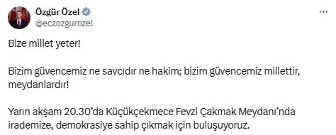 “Bize millet yeter! Bizim güvencemiz ne savcıdır ne hakim; bizim güvencemiz millettir, meydanlardır! Yarın akşam 20.30’da Küçükçekmece Fevzi Çakmak Meydanı’nda irademize, demokrasiye sahip çıkmak için buluşuyoruz.”
