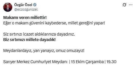 Özel, sosyal medya hesabından yurttaşları mitinge katılmaya davet ederek, "Makamı veren millettir! Eğer o makam güvenini kaybederse, millet gereğini yapar! Siz sırtınızı icazet aldıklarınıza dayadınız. Biz sırtımızı millete dayadık! Meydanlardayız, yan yanayız, omuz omuzayız!" ifadesini kullandı.