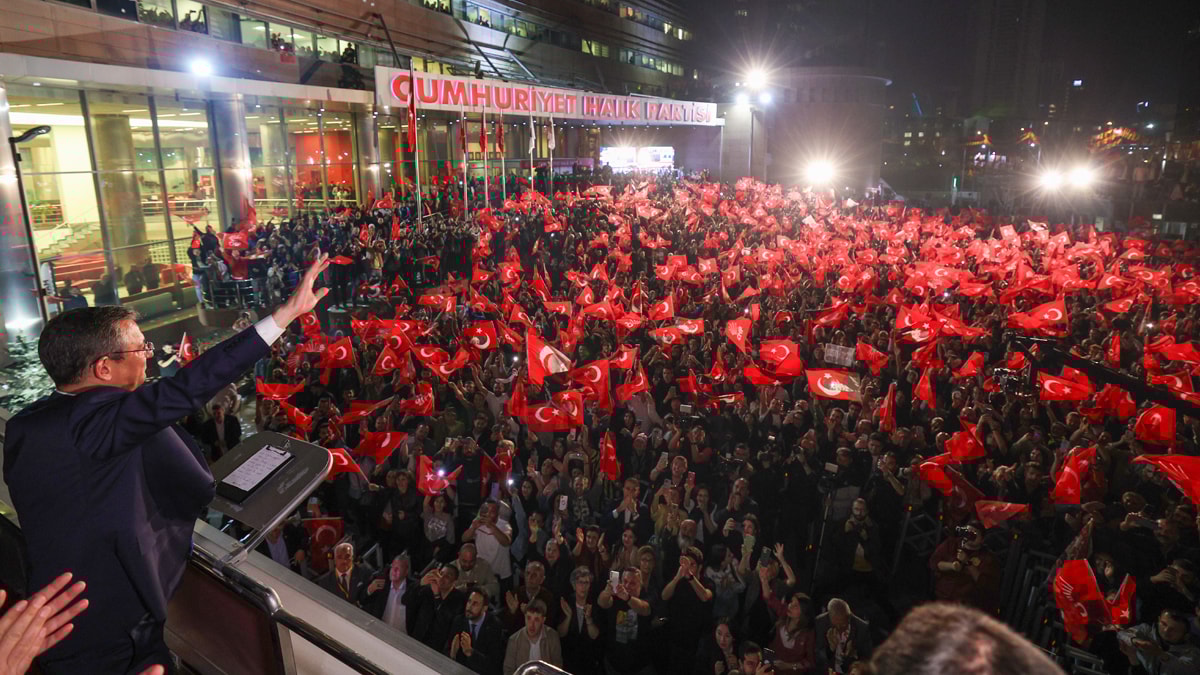 CHP Genel Başkanı Özgür Özel, oy sayımı sürerken parti genel merkezi önünde vatandaşlarla bir araya geldi.