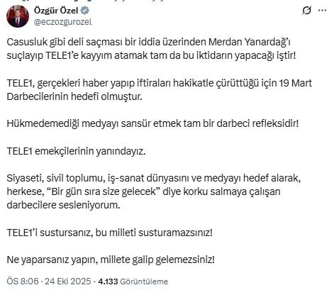 CHP lideri Özgür Özel resmi X hesabından tepki gösterdi. Özel paylaşımında şu ifadeleri kullandı: