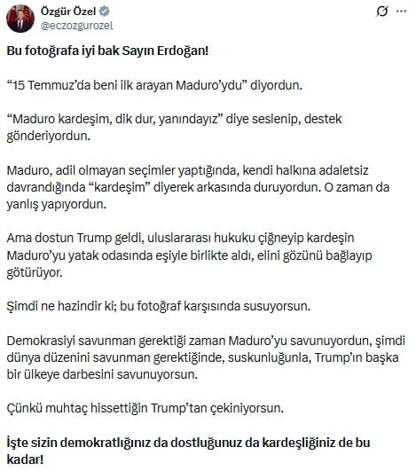 Demokrasiyi savunman gerektiği zaman Maduro’yu savunuyordun, şimdi dünya düzenini savunman gerektiğinde, suskunluğunla, Trump’ın başka bir ülkeye darbesini savunuyorsun.