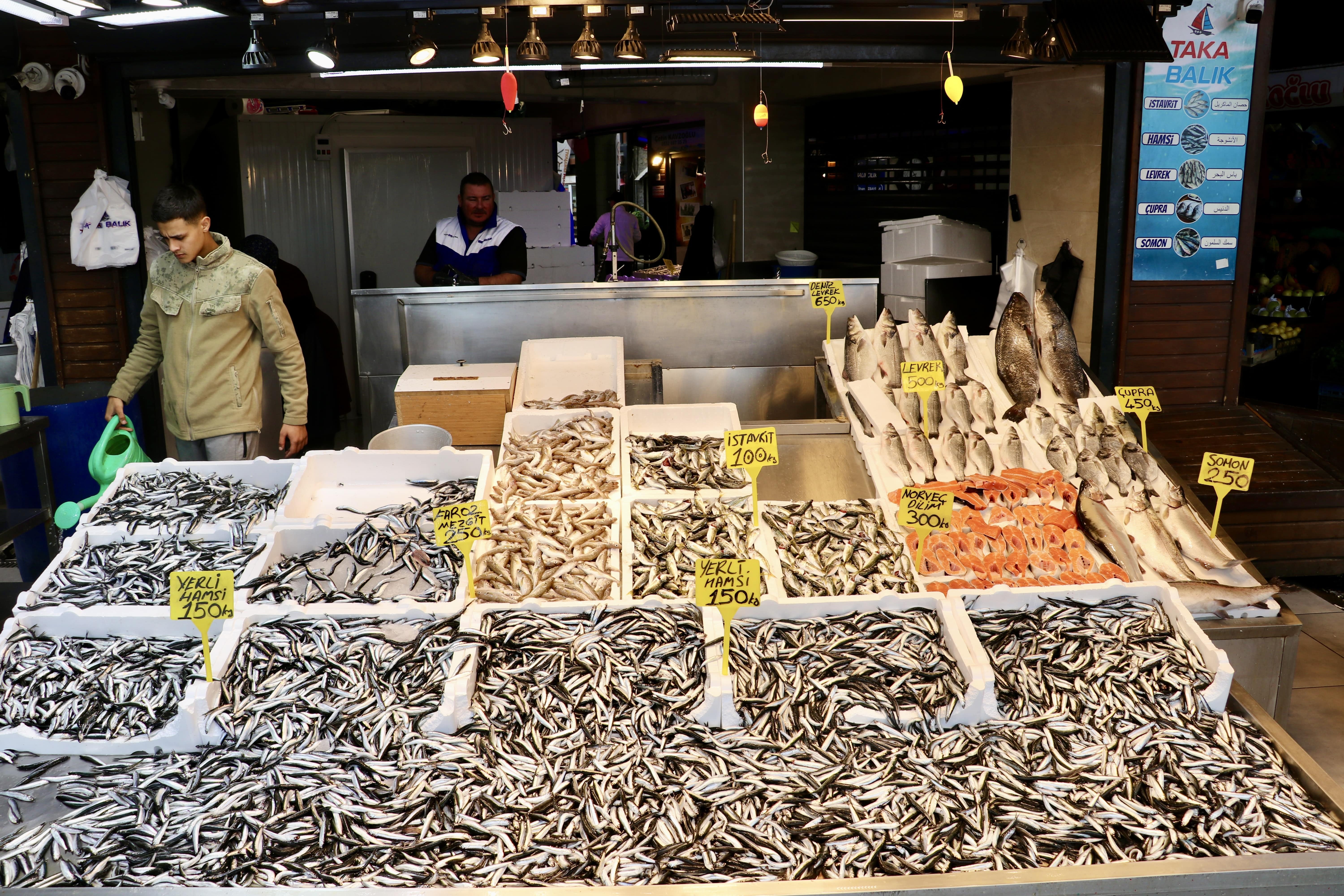 Ortahisar ilçesindeki balıkçı tezgahlarında hamsi ve istavritin kilogramı 100, tirsinin 200, mezgit, alabalık ve somonun 250, palamudun 400, çipuranın ise 450 liradan satılıyor.