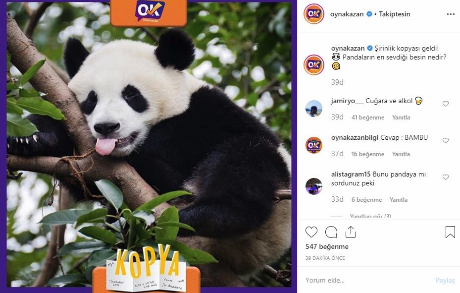 Oyna Kazan, yeni saatlerinde oyunseverlerle buluşuyor. Son zamanların en popüler bilgi yarışmalarından biri olan Oyna Kazan her gün saat 19.00 ve 21.30'da takipçileriyle buluşuyor. Bugünkü kopya şöyle: Pandaların en sevdiği besin nedir?