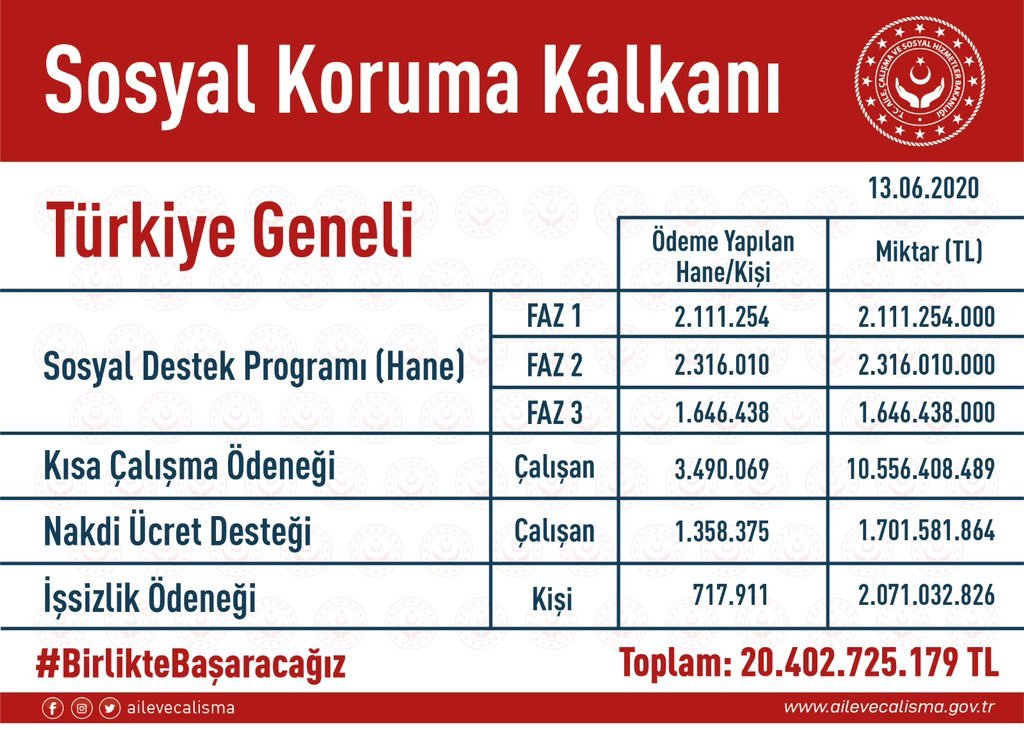Aile, Çalışma ve Sosyal Hizmetler Bakanı Zehra Zümrüt Selçuk, Sosyal Koruma Kalkanı kapsamında sağlanan destekler hakkında bilgilendirme yaptı. Bakan Selçuk sosyal medya hesabından yaptığı paylaşımda 3. Faz'da nakdi ücret desteği sağlanan hane sayısının 1 milyon 646 bin 438'e ulaştığını duyurdu.