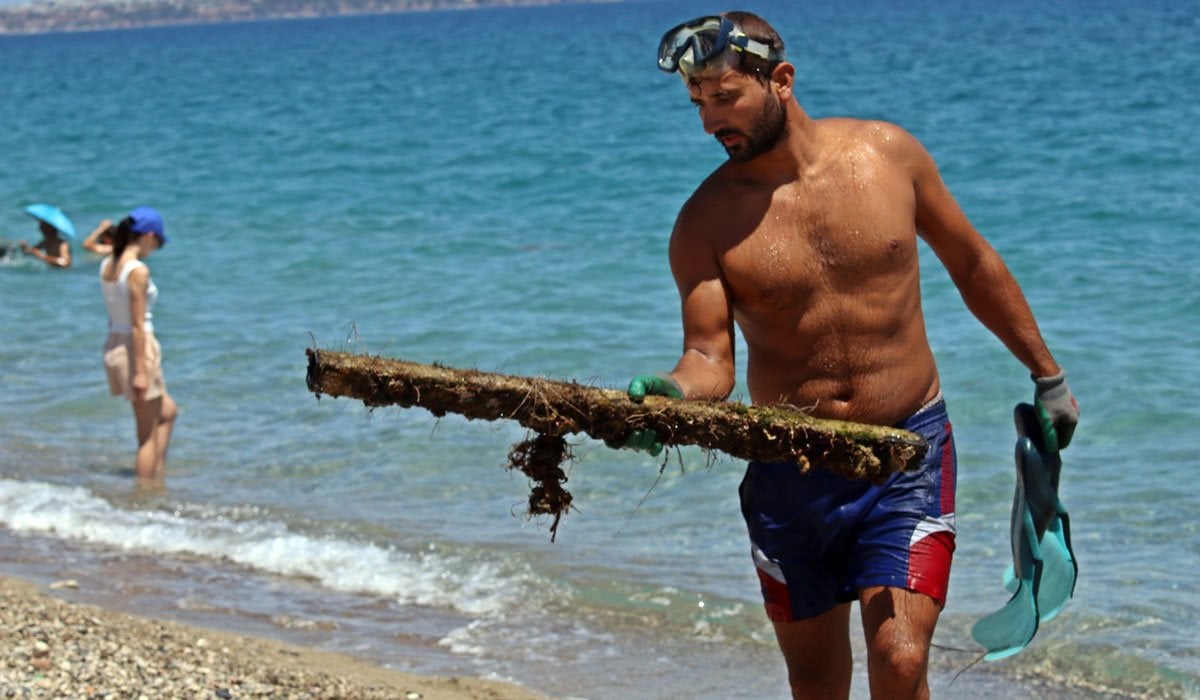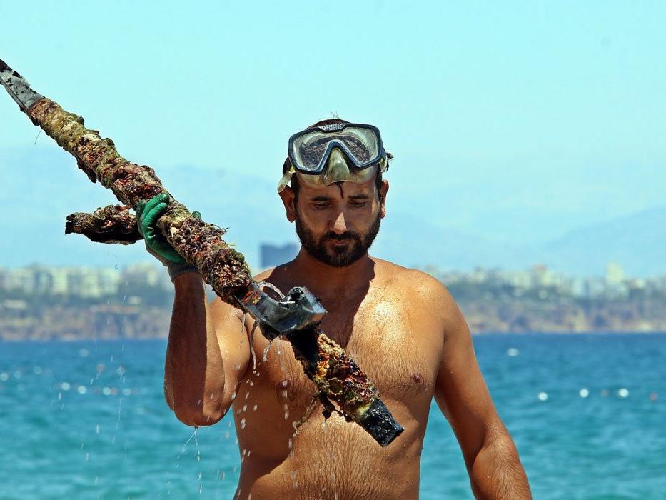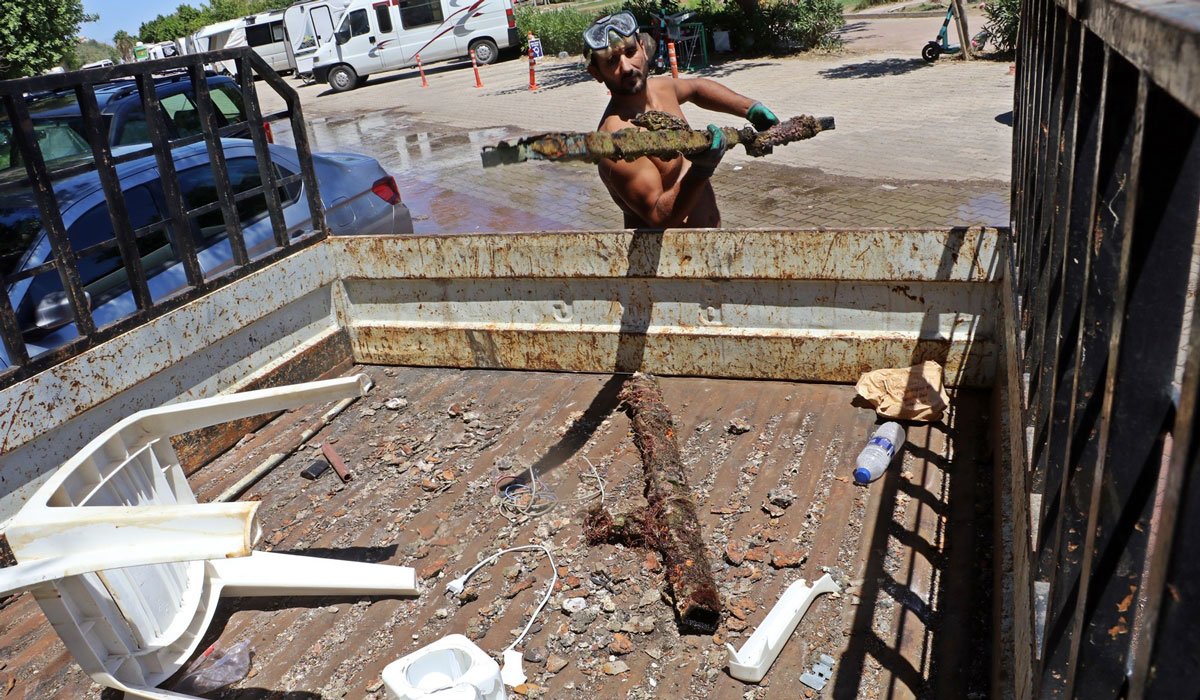 Demirleri geri dönüşüme satabileceği fikriyle her gün sahile gelip denizin dibine tüpsüz palet ve gözlüğüyle dalan Uludağ, günlük 100 ile 150 kilo arasında metal çıkarmaya başladı, bu metalleri geri dönüşüme satarak da aylık kazancını 25-30 bin lira yaptı.