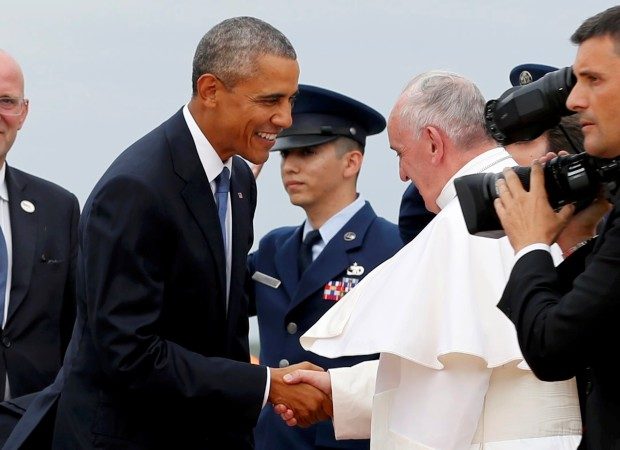 Başkan Obama ve beraberinde heyet, Vatikan ile ABD bayrağını taşıyan uçağın inmesinden sonra serilen kırımızı halıda Papa’nın uçaktan inmesini bekledi.
